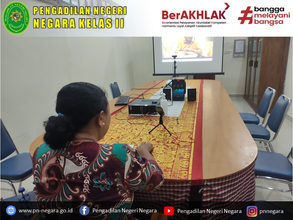 Pada hari Jum’at, 30 September 2022, Bertempat di Ruang Command Center Pengadilan Negeri Negara. Ketua Pengadilan Negeri Negara Ibu Ni Kadek Kusuma Wardani, S.H., M.H mengikuti acara Undangan Pengantar Purnabakti Yang Mulia Prof. Dr. H. Supandi, S.H., M.Hum (Ketua Kamar Tata Usaha Negara Mahkamah Agung) secara daring melalui Aplikasi Zoom Meeting.