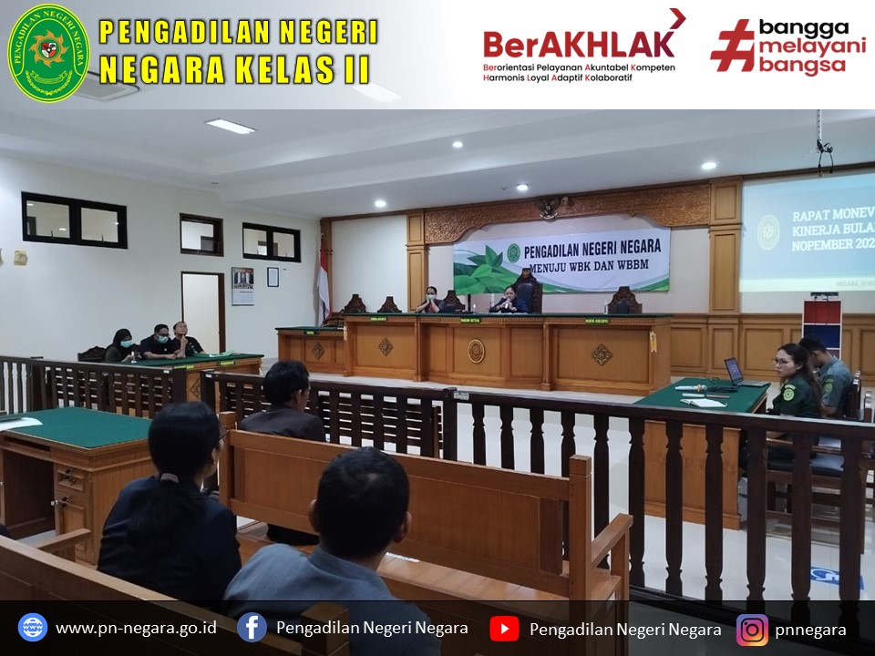 Pada hari Selasa, 29 November 2022 Telah dilaksanakan Monitoring dan Evaluasi Kinerja Bulan November 2022 Bertempat di Ruang Sidang Cakra Pengadilan Negeri Negara. Rapat dipimpin oleh Ketua Pengadilan Negeri Negara Ibu Ni Kadek Kusuma Wardani, S.H., M.H. dan dihadiri oleh Wakil Ketua, Para Hakim, Sekretaris, Panmud, Kasubbag dan Seluruh Pegawai dan PPNPN PN Negara.