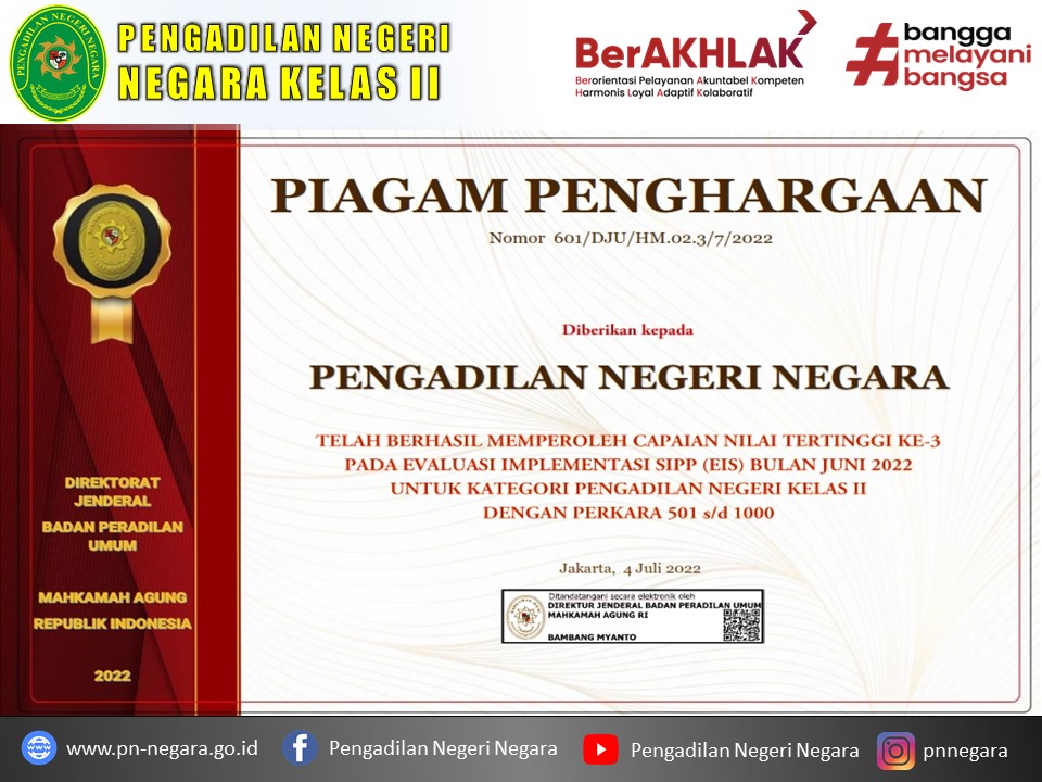 Kamis, 7 Juli 2022 bertempat di Ruang Command Center, Ketua Pengadilan Negeri Negara Ibu Ni Kadek Kusuma Wardani, S.H., M.H., Wakil Ketua Pengadilan Negeri Negara Ibu Ni Gusti Made Utami, S.H., para Hakim dan Panitera Pengadilan Negeri Negara, mengikuti Pemberian Piagam Penghargaan Evaluasi Implementasi SIPP (EIS) Periode Bulan Juni Tahun 2022 secara daring Melalui Aplikasi Zoom Meeting. Terdapat 45 Pengadilan Negeri yang mendapatkan penghargaan peraih penilaian EIS terbaik yang terbagi dalam beberapa kategori berbeda berdasarkan jumlah perkara yang diselesaikan, dimana Pengadilan Negeri Negara memperoleh capaian nilai tertinggi ke-3 untuk kategori Pengadilan Negeri Kelas II dengan Perkara 501 s/d 1000. Pada acara tersebut, Direktur Jenderal Badan Peradilan Umum mengapresiasi kerja para ketua pengadilan beserta jajarannya dan berharap bagi pengadilan yang belum memenuhi kriteria untuk dapat terus meningkatkan kinerjanya.