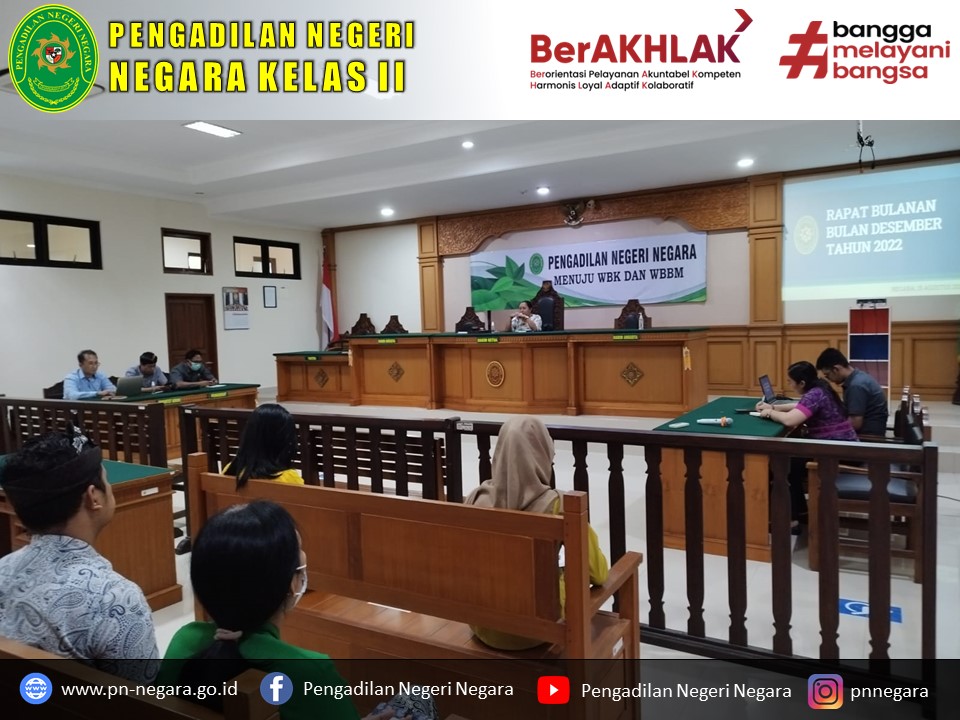 Pada hari Kamis, 15 Desember 2022 Pengadilan Negeri Negara melaksanakan Rapat Bulanan Bulan Desember Tahun 2022. Rapat Bulanan dipimpin oleh Ibu Ni Kadek Kusuma Wardani, S.H., M.H. selaku Ketua Pengadilan Negeri Negara.